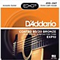 EXP Coated Phosphor Bronze Strings provide longer life and increased durability coupled with the brightness, clarity and sensitivity you've come to expect from D'Addario acoustic guitar strings. Here is how it works: An ultra-fine layer of EXP coating is bonded to the phosphor bronze wrap wire which is then wound onto the hex-shaped core wire. The result is a built-in barrier against the corrosion and wear that can quickly sap the life from your strings and your sound. And since the EXP coating is cross-linked to the wrap wire prior to winding, the strings sound fresh and bright. New-string tone lasts 3 to 4 times longer than traditional guitar strings.