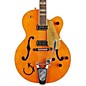 Town Hall Party! This tribute to the early Gretsch Chet Atkins Hollow Body models of the mid-'50s features full western appointments, including a G brand on the upper bout, western-engraved fingerboard inlays and a steer's head headstock inlay. Other features include a 2-3/4"-deep laminated maple body, dual DynaSonic™ single-coil pickups, polished Bigsby® vibrato tailpiece with vintage flat handle, Grover® Sta-Tite™ machine heads, arrow knobs, aged binding, gold hardware and stain finish. Includes case.