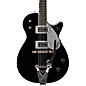 The G6128T-TVP Power Jet™ puts a snarl into That Great Gretsch Sound!™ It’s a modified version of the classic Duo Jet, with a bound single-cutaway chambered mahogany body, arched top, one-piece mahogany neck and bound ebony fingerboard with Neo Classic™ thumbnail inlays. Other features include dual TV Jones® Power’Tron™ pickups, three-position pickup switch, three-position master tone switch, silver plexi pickguard, bound headstock with pearloid Gretsch® logo inlay, Sperzel® locking tuners, pinned Adjusto-Matic™ bridge, Bigsby® B3C vibrato tailpiece, and mahogany stain finish with jet black top. Includes case.