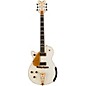 A veritable holy grail among classic electric guitar aficionados, the Gretsch® White Penguin combines the gold and glitter of the Falcon with the sleek style of the Duo Jet. Features include single-cutaway semi-hollow body with arched top and gold-sparkle binding, one-piece mahogany neck, gold-sparkle-bound ebony fingerboard with feather-motif hump block inlays, gold-sparkle-bound headstock with inlaid winged Gretsch logo and gold-sparkle truss rod cover, dual DynaSonic single-coil pickups, three-position pickup switch, gold plexi pickguard with Penguin motif, rhinestone and white dot control knob inlays, Synchro-Sonic bridge, Gretsch G Cadillac® tailpiece, gold-plated Grover® Imperial tuners, banjo armrest and gold-plated hardware.