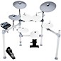 The configuration features a three 9" dual-zone tom pads, a 9" dual-zone snare pad, 10-inch hi-hat, 14-inch ride and a 12-inch chokeable crash cymbal. The cymbal pads respond with a natural rebound. The kick tower has a 9-inch pad and a specially-engineered support structure that ensures the stability and familiar feel of a real bass drum. Also includes a "soft stroke" beater for quiet play of the bass drum.