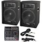 An affordable, compact PA system with powered mixer, 12" speakers, microphone, and cables.